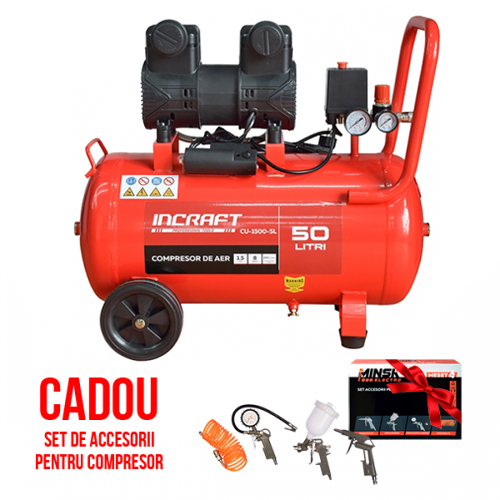 Компрессор 50л 1.5кВт, 2 цилиндра INCRAFT CU-1500-SL (безмасляный)