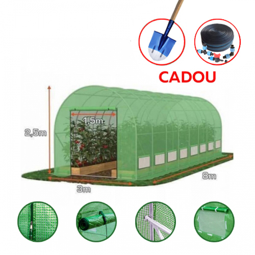 Теплица 8x3x2,5 м, армированная пленка 180 г/м², оцинкованные трубы 26x0,9 мм. Эта теплица идеальна для посадки яровых, летних, осенних и зимних культур. Свернув боковые пленки, можно обеспечить необходимую вентиляцию в летние дни. На 24 м² достаточно места для посева, посадки и выращивания овощей и растений. Растения будут надежно защищены от ветра, дождя, града, снега, сильного солнечного света и повреждений от птиц. Специальная армированная пленка помогает оптимально выращивать растения.